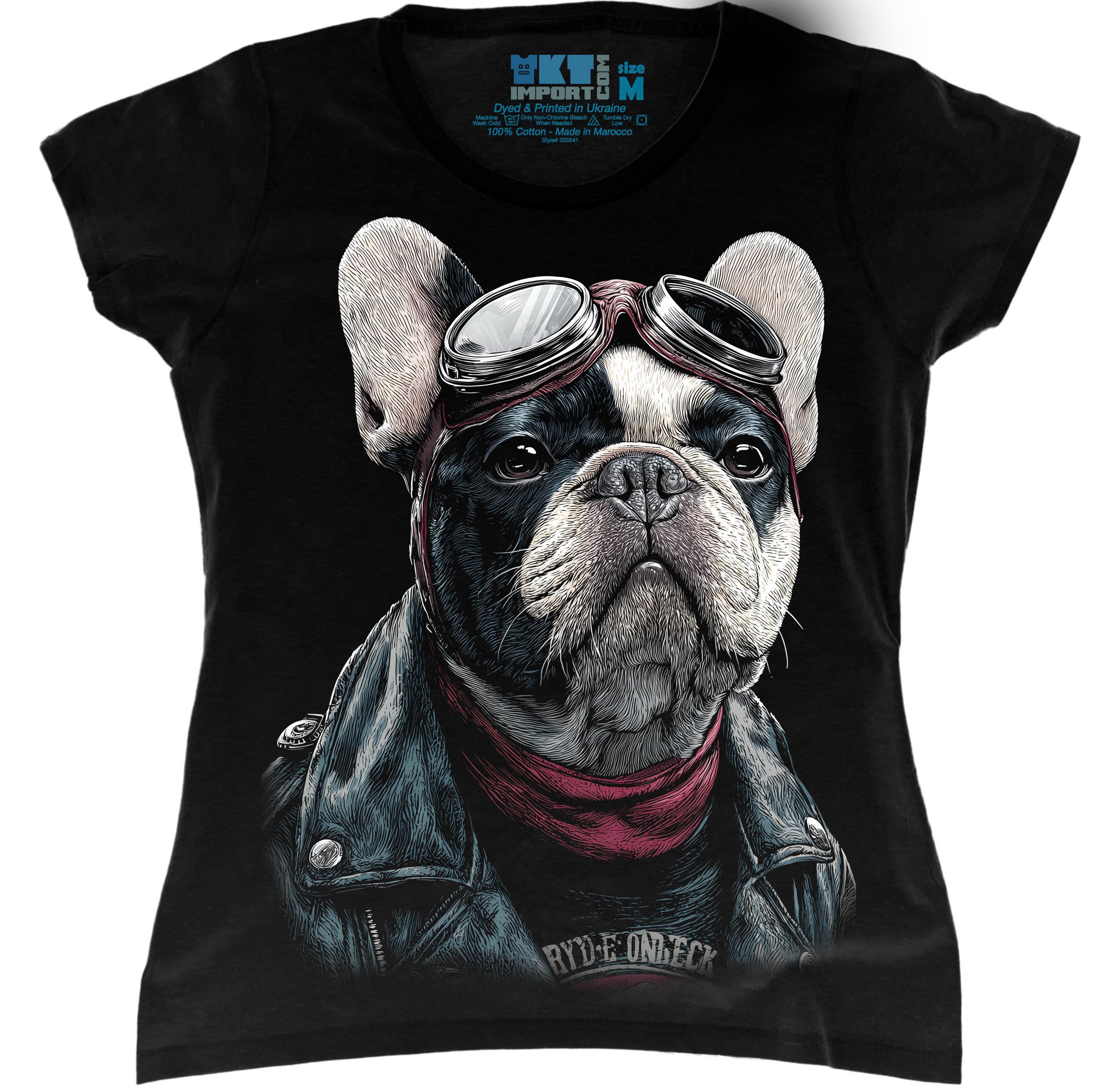 Жіноча футболка з ефектним принтом французького бульдога в стильному байкерському образі. Такий дизайн виглядає модно, оригінально й одразу привертає увагу.