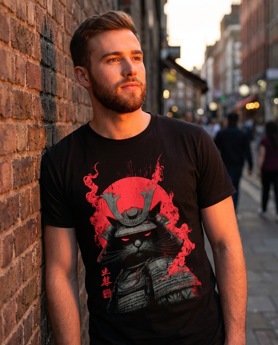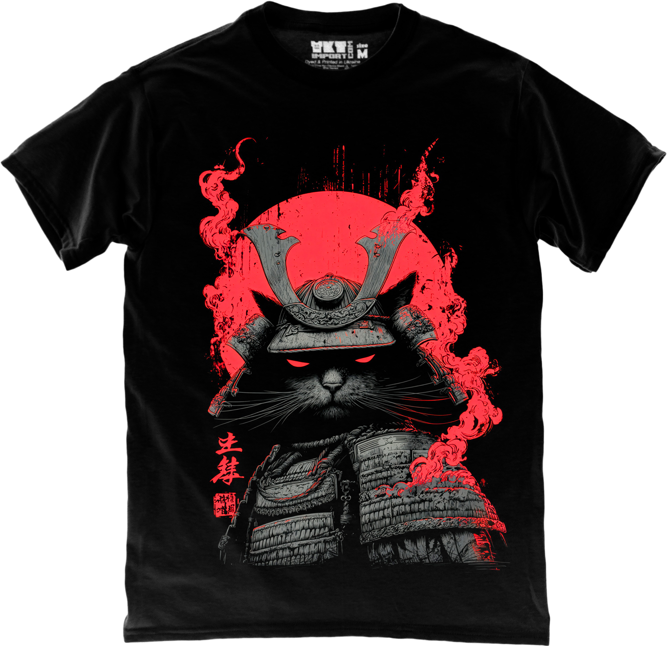 Стильна футболка з потужним принтом кота-самурая у темній воїнській естетиці. Контраст червоного сяйва, диму та виразного образу створює сильний дизайн із характером.