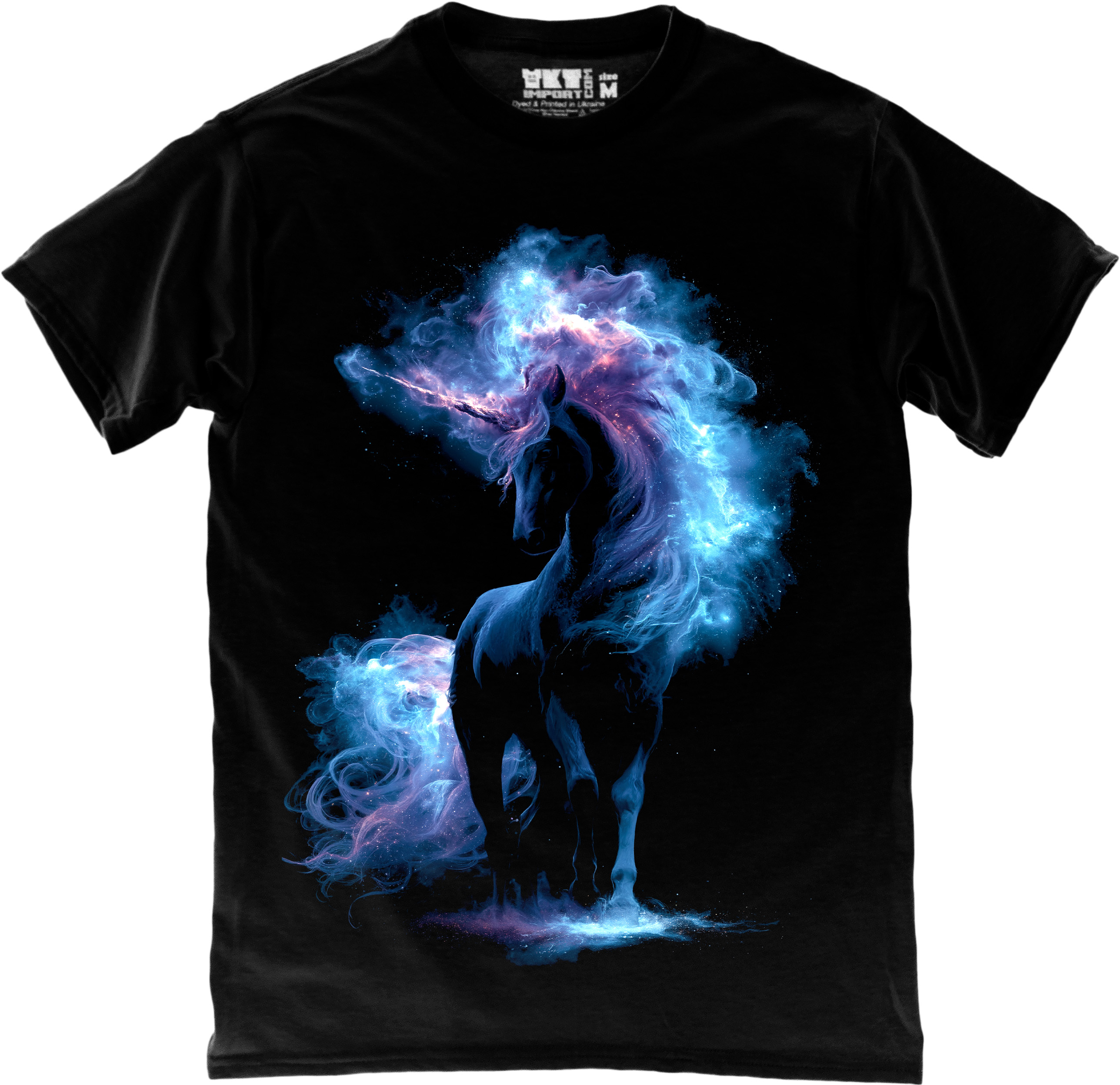 Стильна футболка з чарівним принтом єдинорога у сяйві космічної туманності. Поєднання глибоких синіх і фіолетових відтінків створює яскравий, магічний та по-справжньому фантазійний образ.