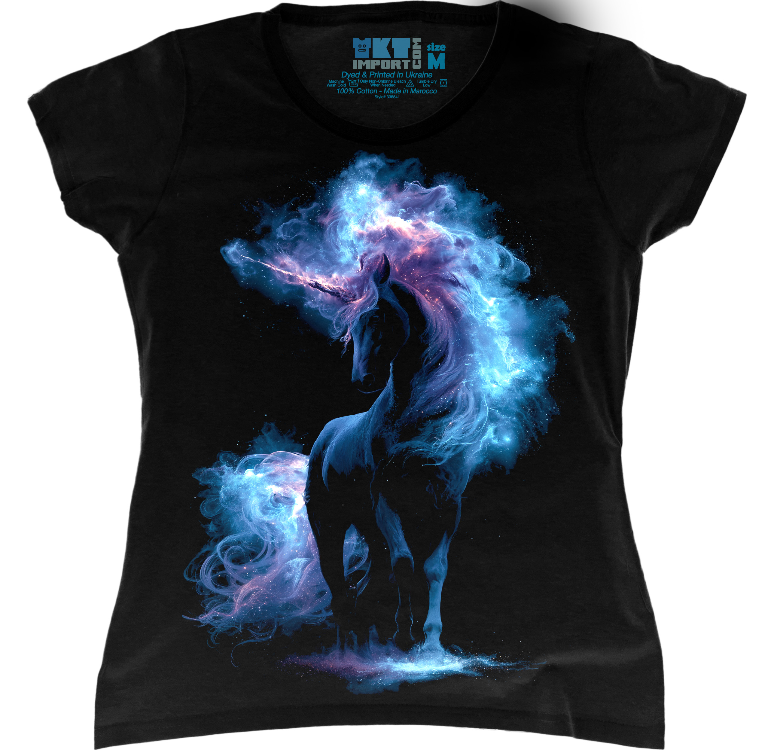 Жіноча футболка з яскравим принтом єдинорога у космічних кольорах. Дизайн виглядає ніжно, чарівно та водночас дуже стильно, створюючи особливий настрій у повсякденному образі.