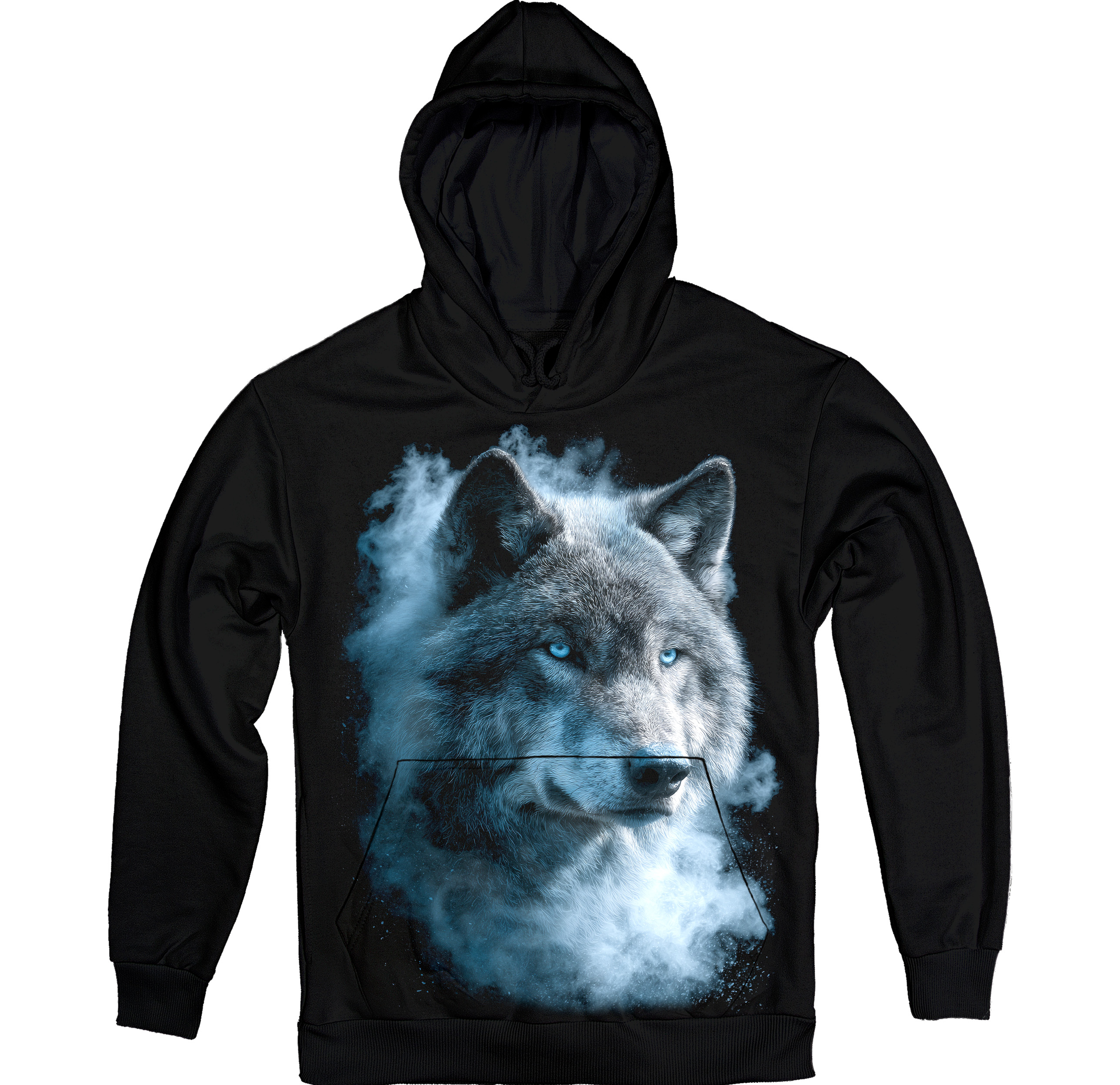 Тепле худі з атмосферним принтом вовка в холодній туманній естетиці. Контраст темного фону та блакитного сяйва створює глибокий і виразний образ.