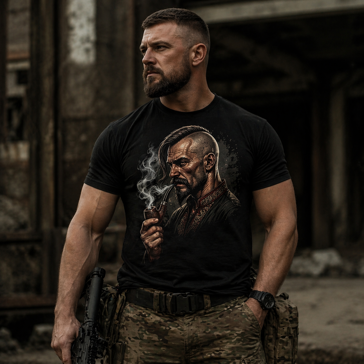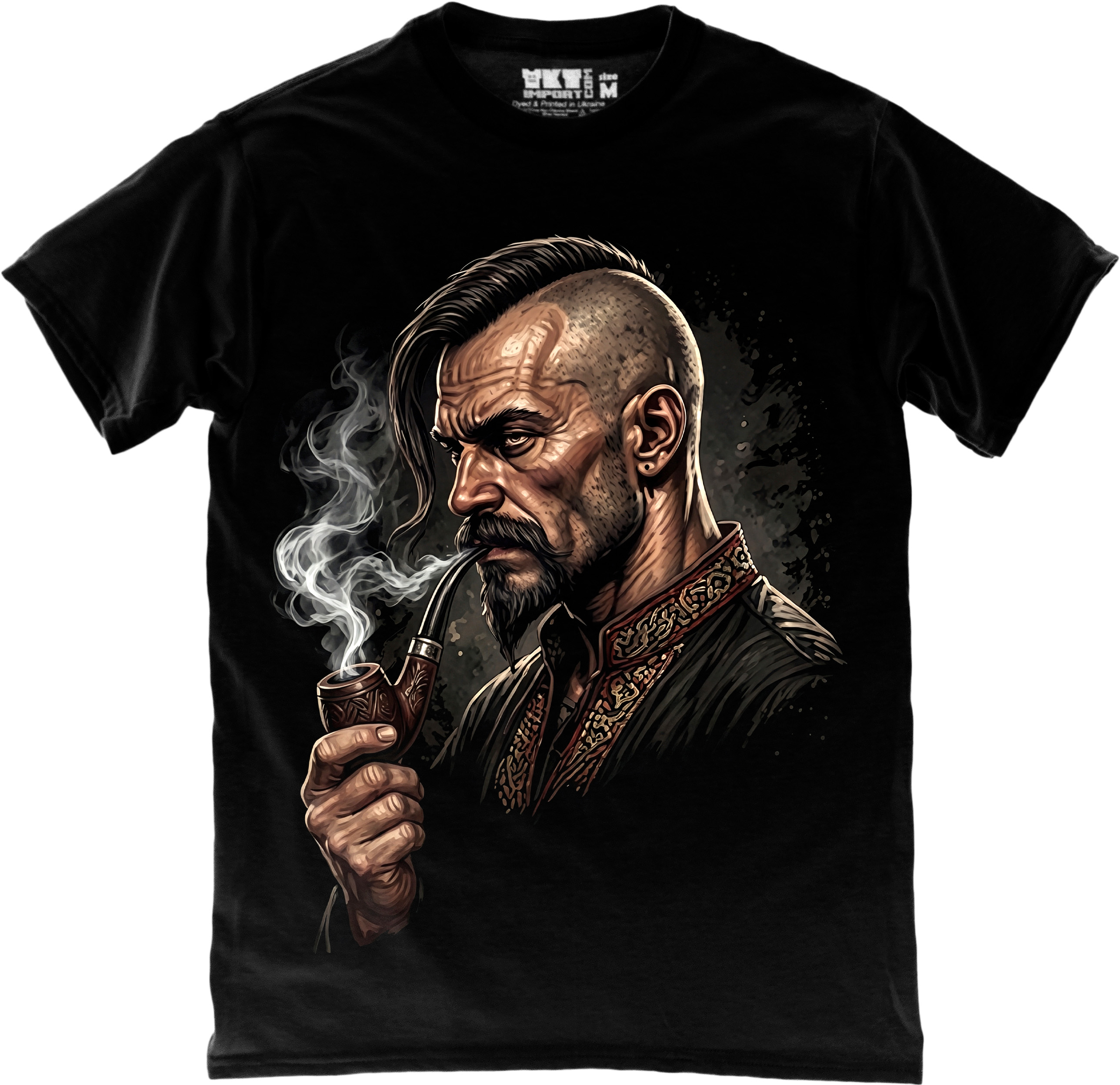 Стильна футболка з деталізованим портретом козака, що випромінює силу, спокій і впевненість. Глибокий образ із характером для тих, хто цінує справжню мужність і стиль.