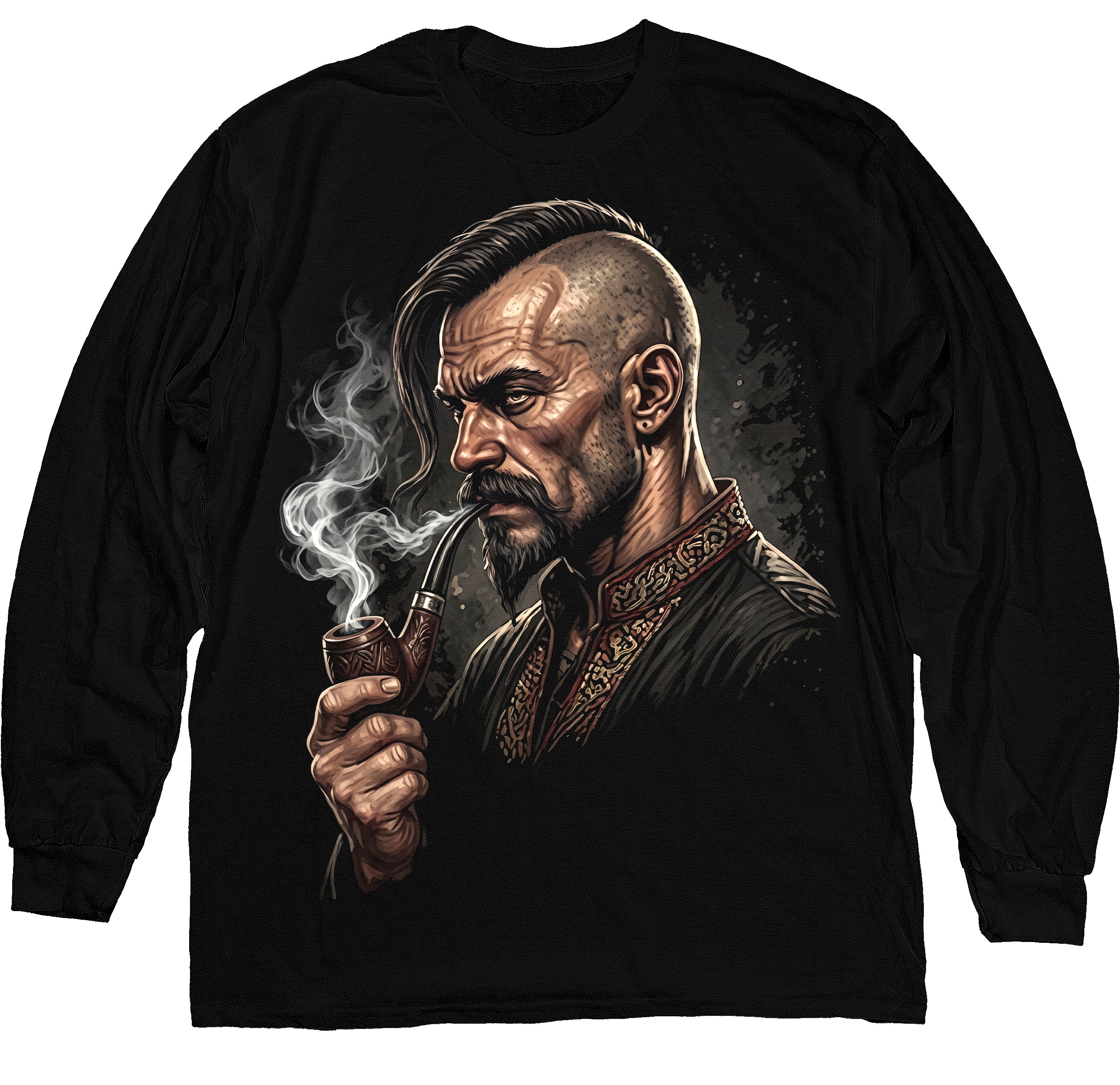 Тепле худі з виразним принтом козака в атмосферному виконанні. Дим, строгий погляд і деталізація створюють сильний, брутальний образ.