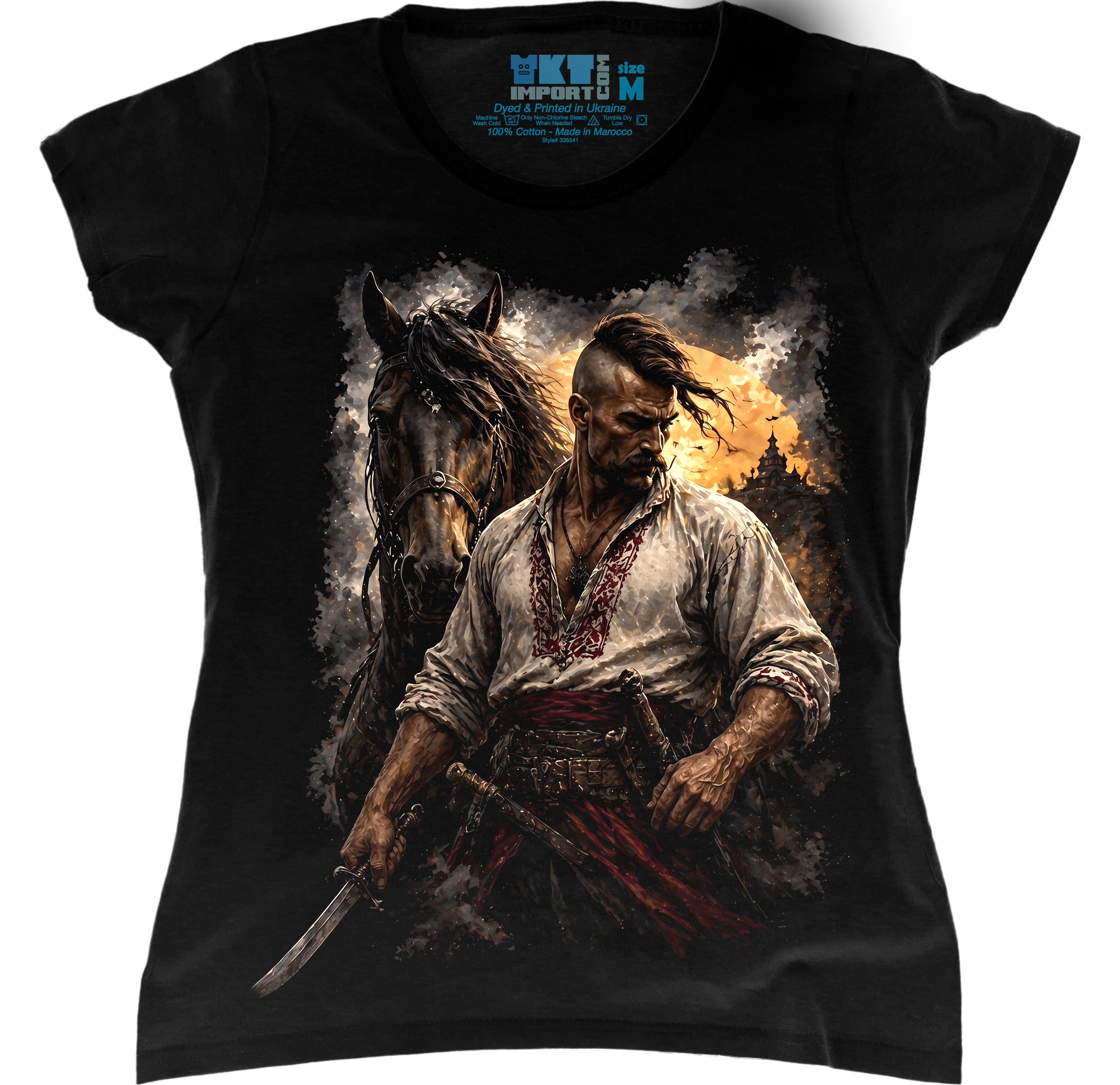 Жіноча футболка з сильним і атмосферним принтом козака. Дизайн виглядає стильно, виразно та додає образу впевненості й характеру.