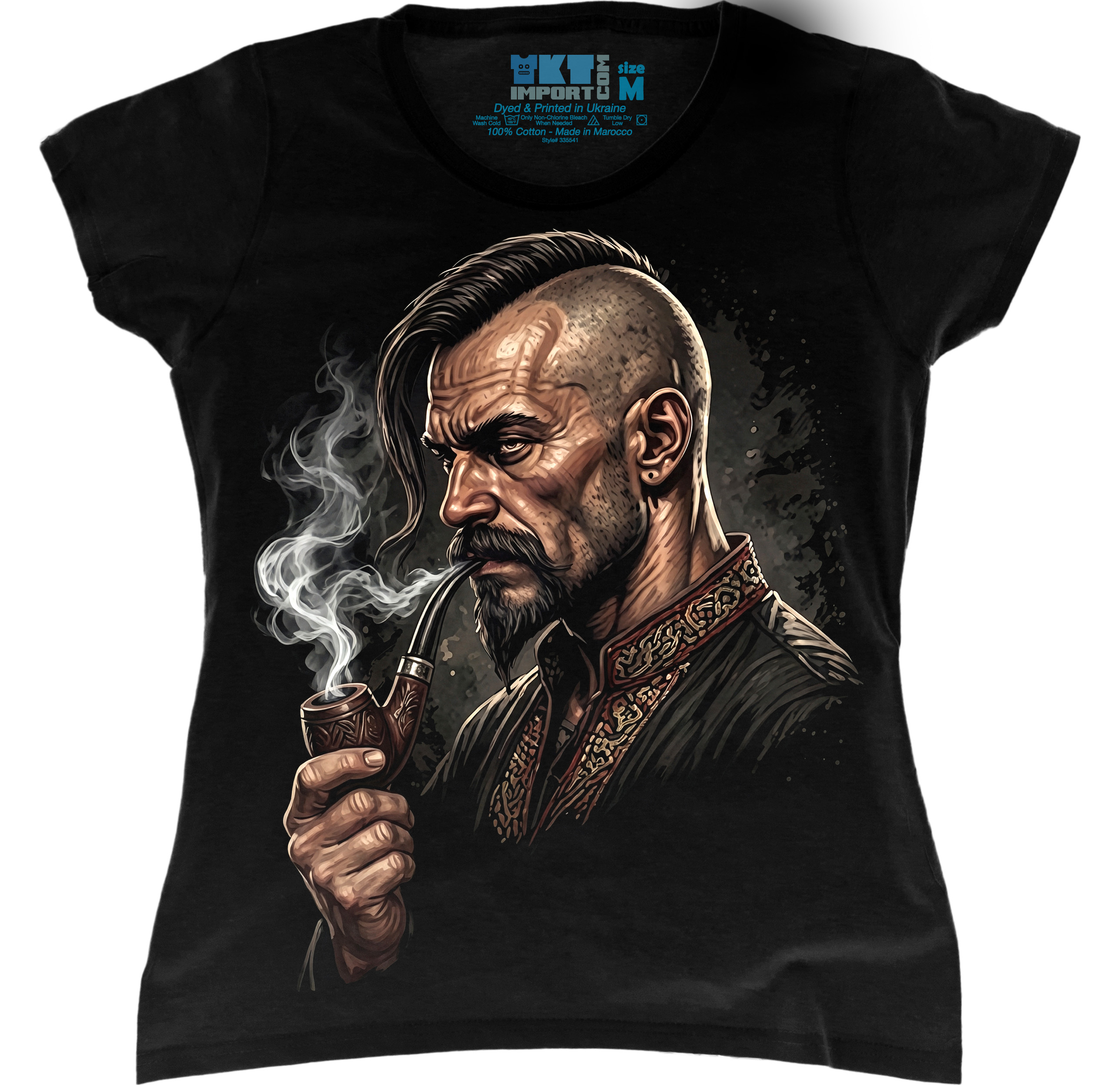 Жіноча футболка з сильним і харизматичним образом козака. Дизайн виглядає стильно, сучасно та додає впевненості в кожному образі.