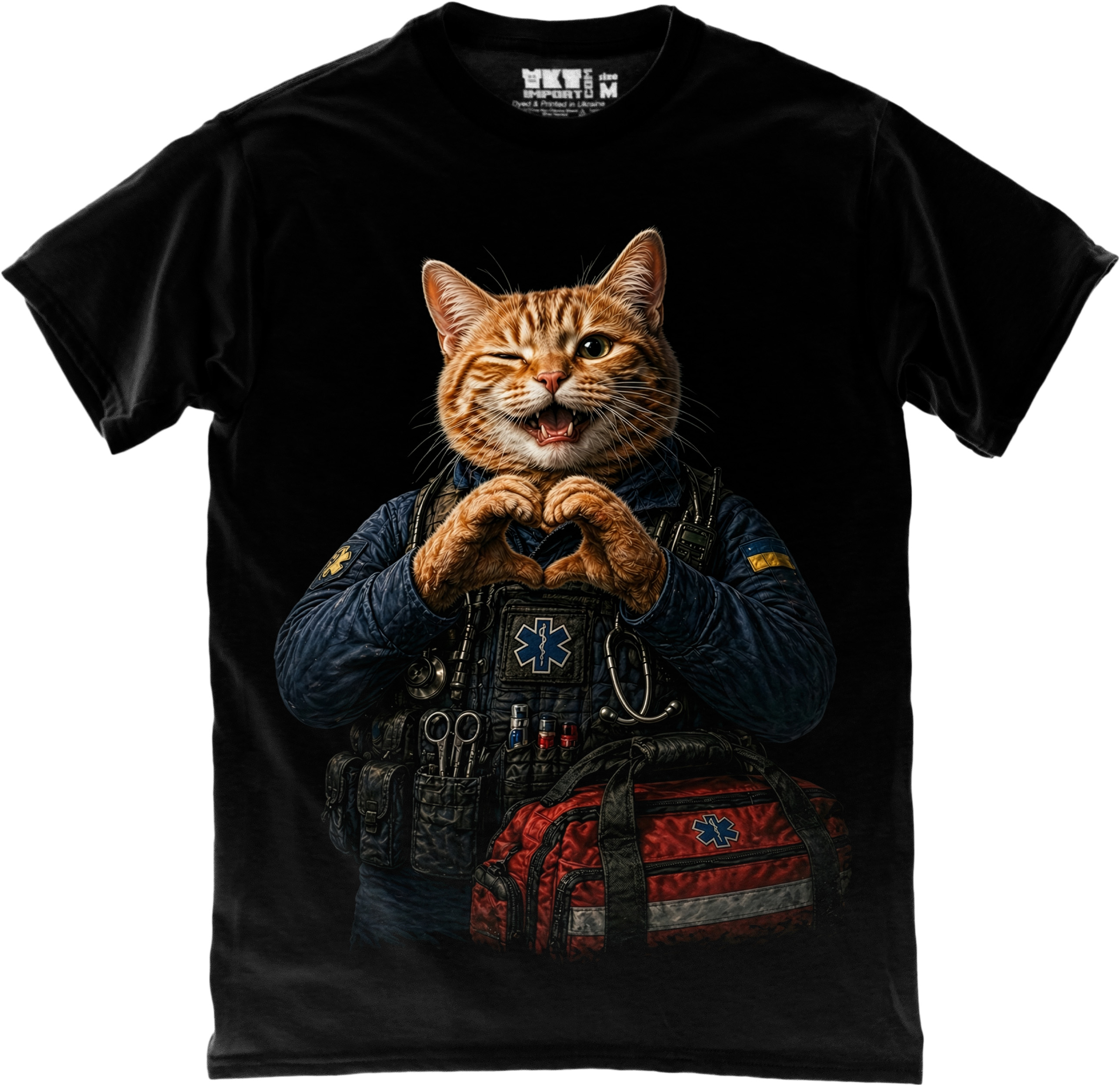 Стильна футболка з яскравим принтом кота-парамедика, який символізує турботу, швидкість і справжню відданість справі. Оригінальний дизайн із характером і добрим настроєм.