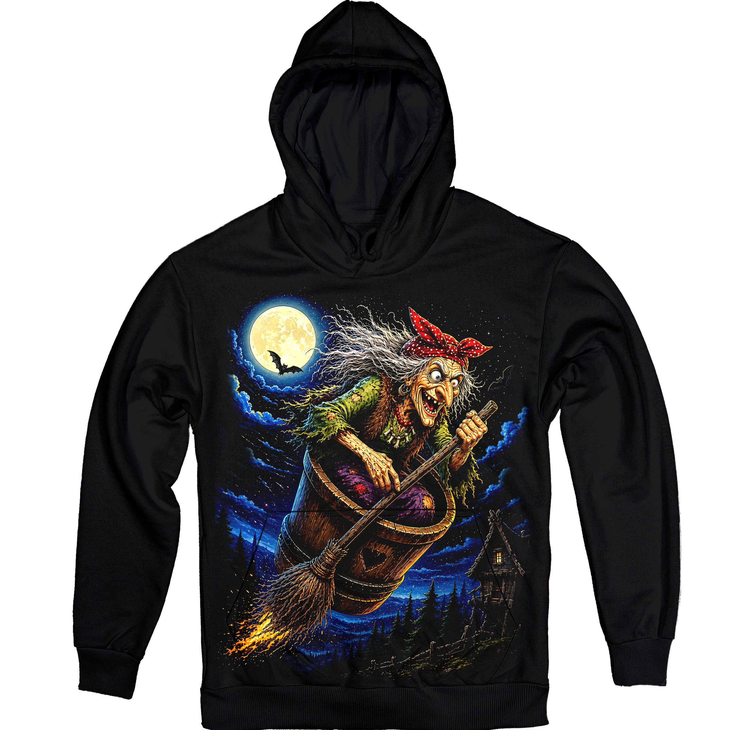 Тепле худі з ефектним нічним принтом Баби Яги в польоті. Насичені кольори, місячне світло та казковий сюжет створюють атмосферний і дуже живий образ.